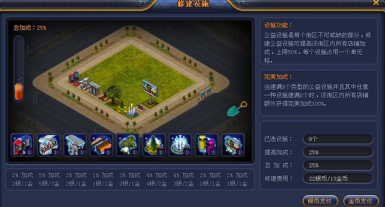 设施完美加成是提升店铺预计收入的方法中性价比最高的。成本只要40银币左右,效果最高可提升150%的加成。设施完美加成的方法是:在一个街区中每种设施各开设一个,再另外将其中的一种设施开满8个,共计16单位面积,正好充分利用了街区剩余的空位。