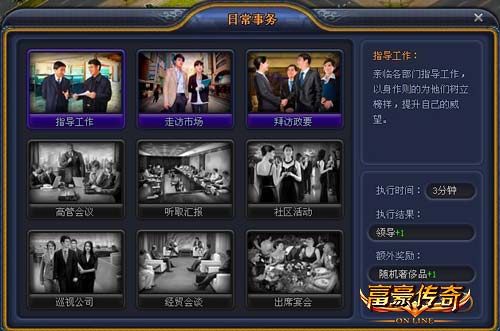 执行日常事务可以提升董事长的领导、策略和魅力三种属性。当这三种属性达到一定程度时便可获得一定的头衔,并开启管理技能的学习资格。执行3分钟模式的日常事务还会随机获得一件奢侈品,我们可以将它在奢侈品市场卖出,作为前期重要的资金来源之一。