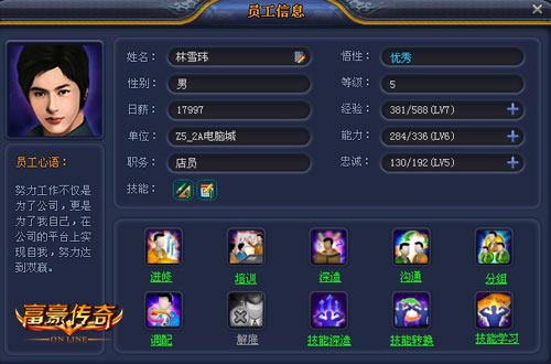 俗话说:不想当将军的兵不是好兵。同样的只有了解自己手下的将军才是个好将军。陪游富豪传奇中的员工在游戏中是非常重要的,选择一批有能力的员工对公司的帮助是非常之大的,所以充分了解自己的手下是老板首要的任务!