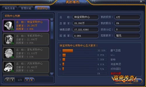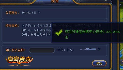 投资的目的当然是为了分红,陪游富豪传奇中投资的分红是非常可观的哦!计算方式是:投资分红=玩家所占股份X分红比例X该采购中心当日的销售总额。采购中心当日的销售总额为服务器VIP1级以上的玩家当日采购该采购中心所售货物的总金额。也就是说,玩家投资的采购中心销售额最大,所得到的分红也就越多,所以在选择采购中心的时候,不妨做一下市场调查,了解哪个采购中心比较值得投资。