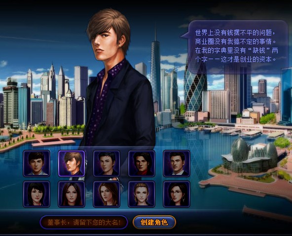 紧接着,你就得创建角色,留下你的大名,豪言壮语开启自己的创业之路,游戏系统有一段很激励斗志的话是这样说道:世界上没有钱摆不平的问题。商业圈没有我搞不定的事情。在我的字典里没有“缺钱”两个字--这才是创业的资本!